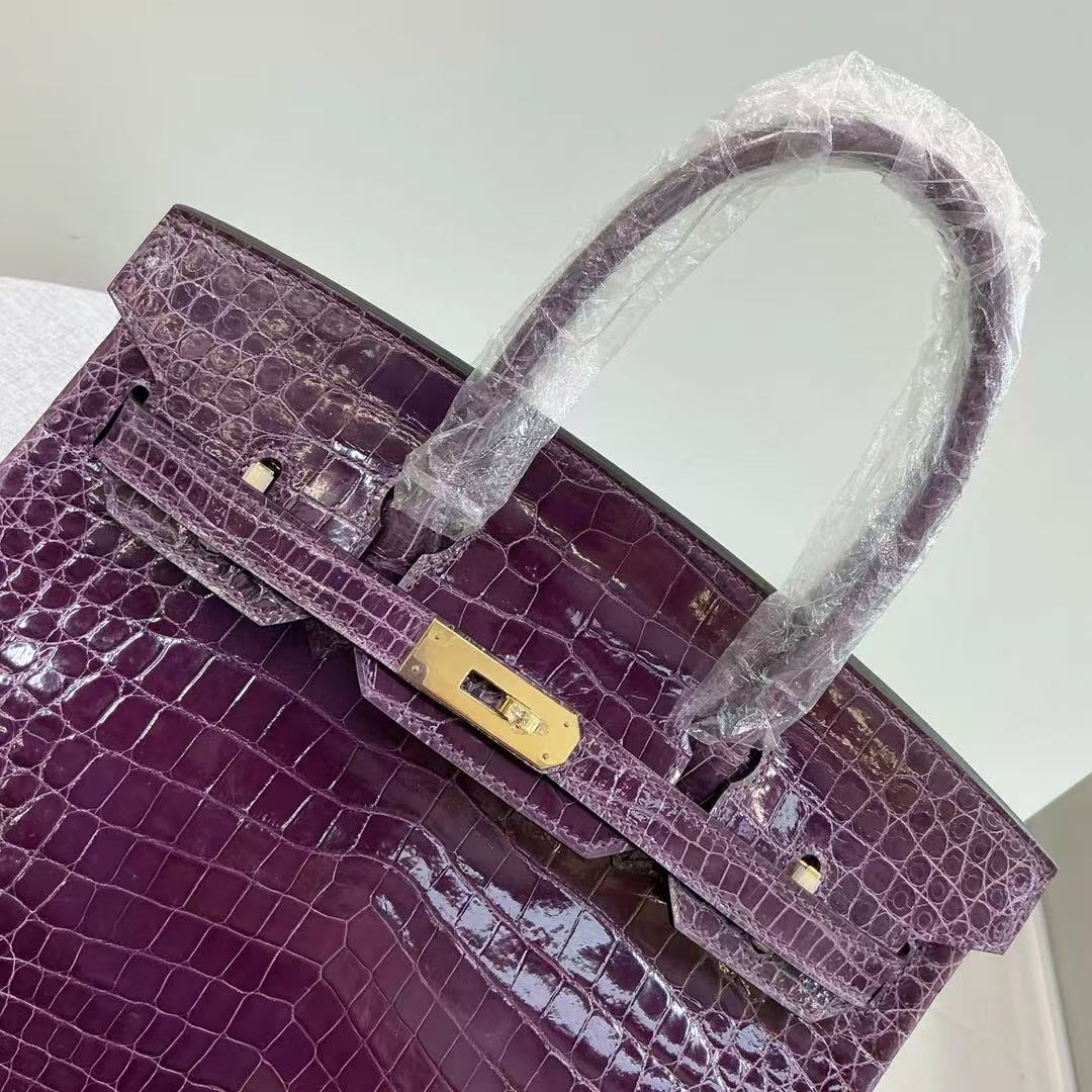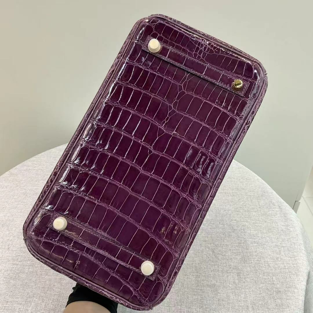 Birkin 25-35 inverted V shiny crocodile grape purple Gold buckle