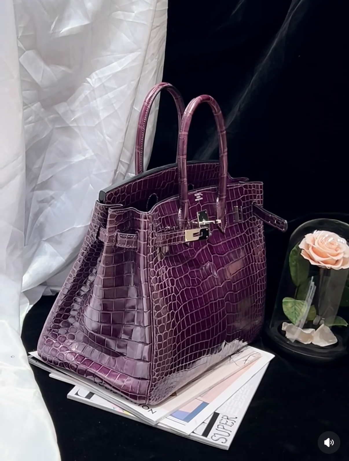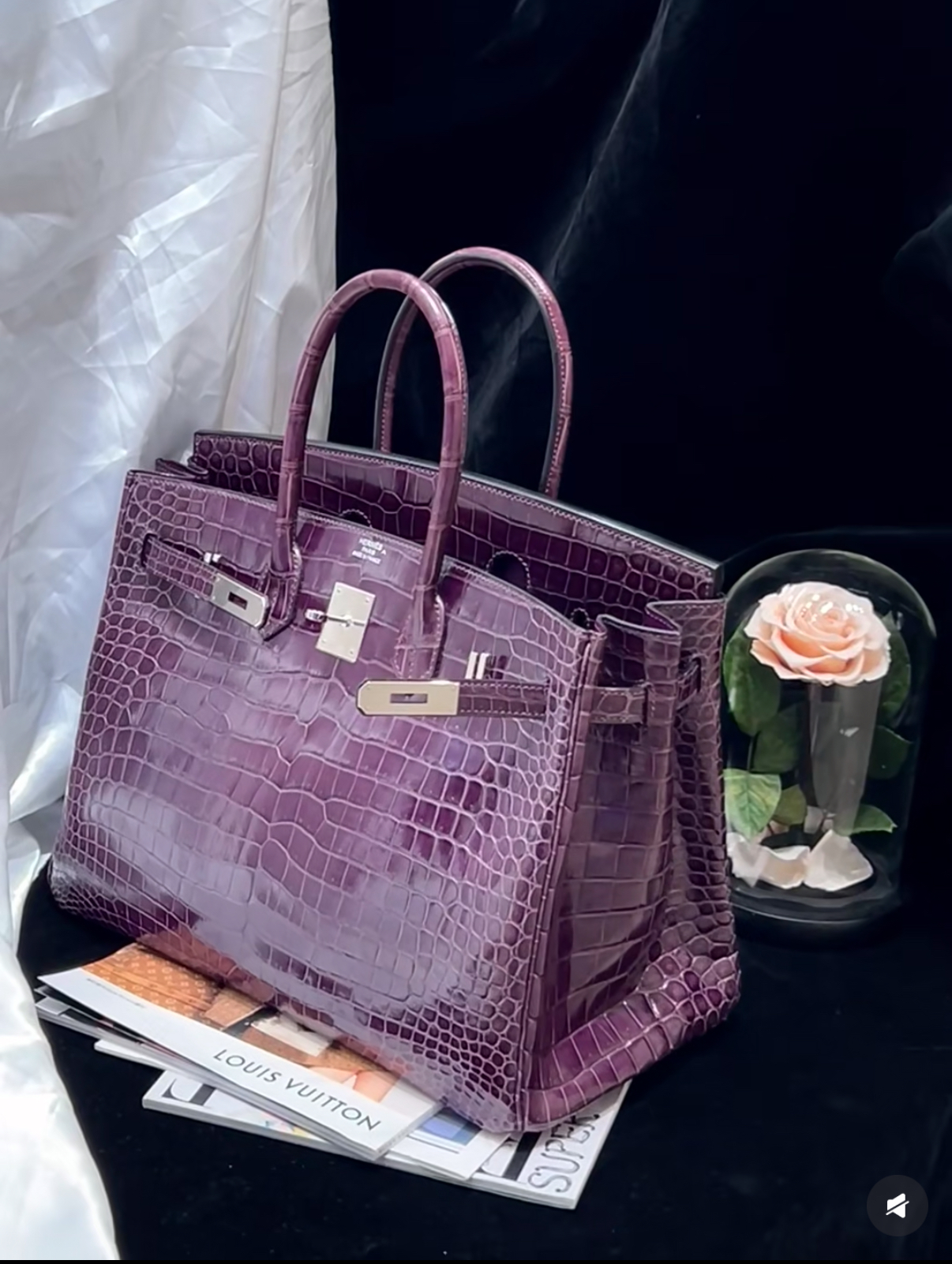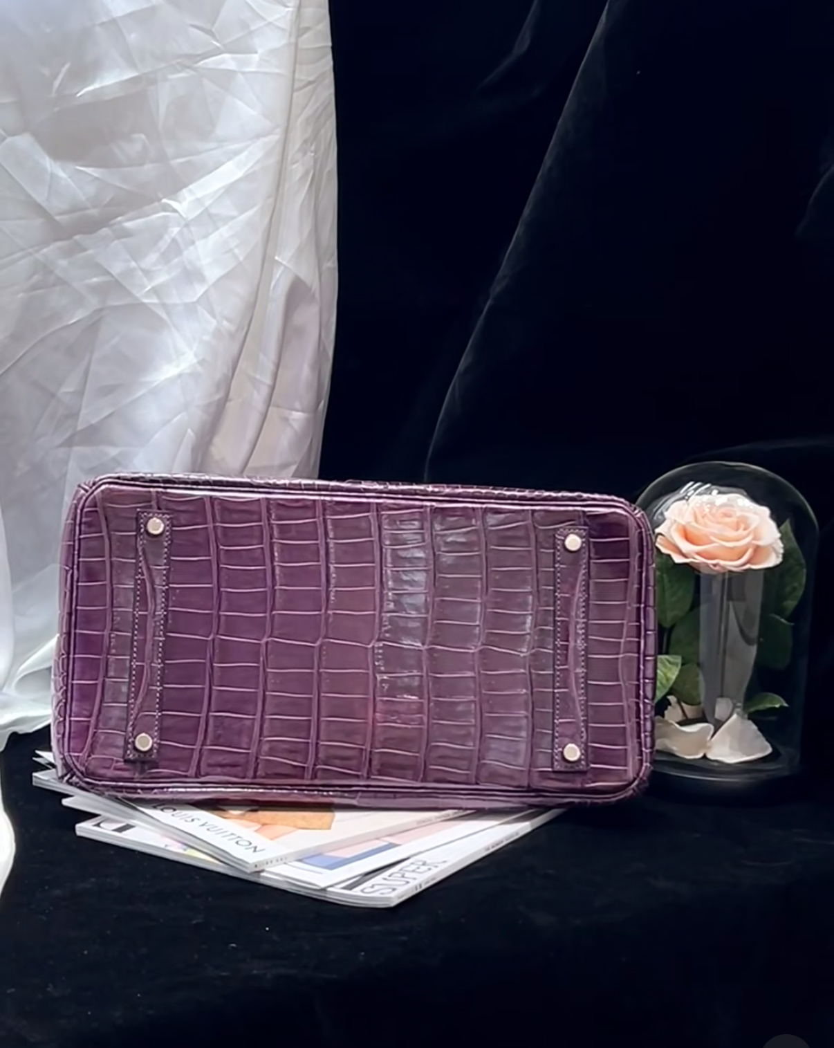 Birkin 25-35 inverted V shiny crocodile grape purple silver buckle