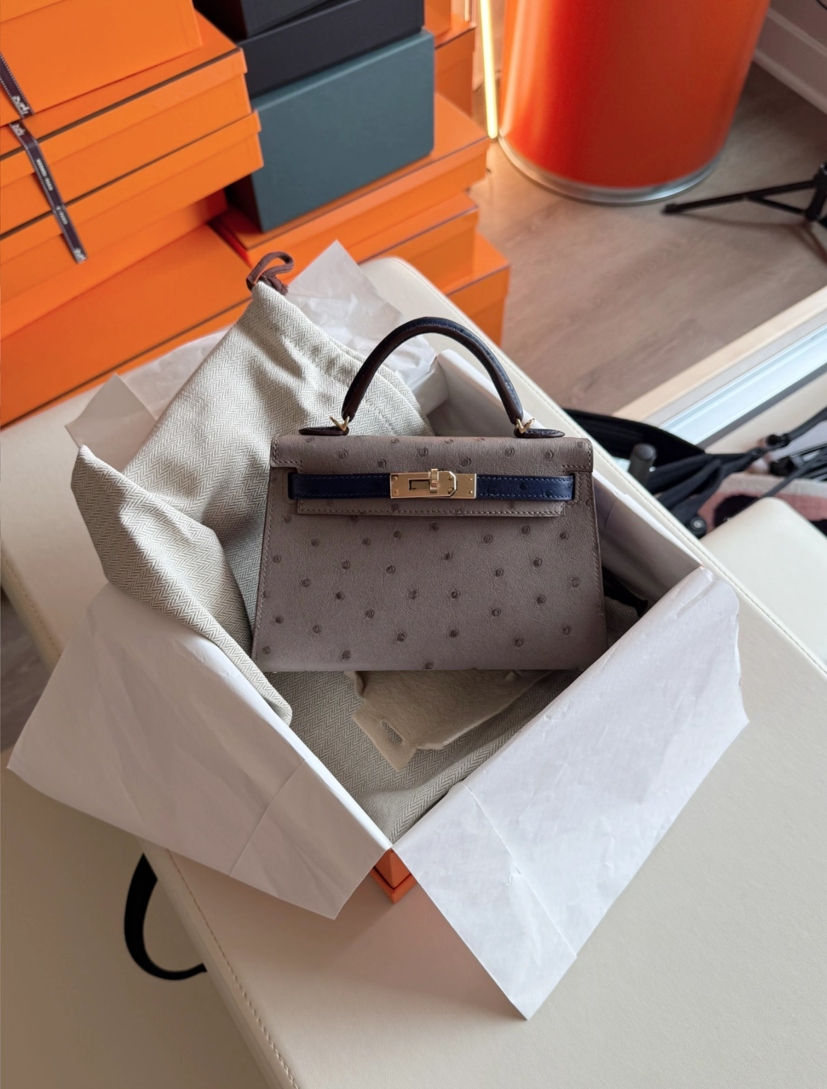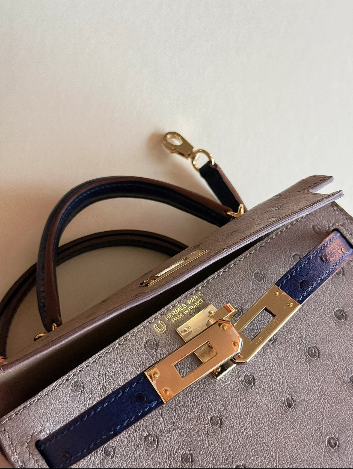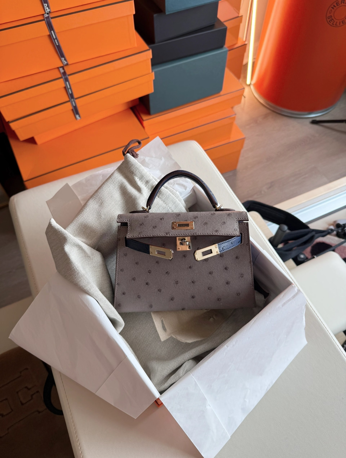 mini Kelly 19cm trench coat gray ostrich leather Customized