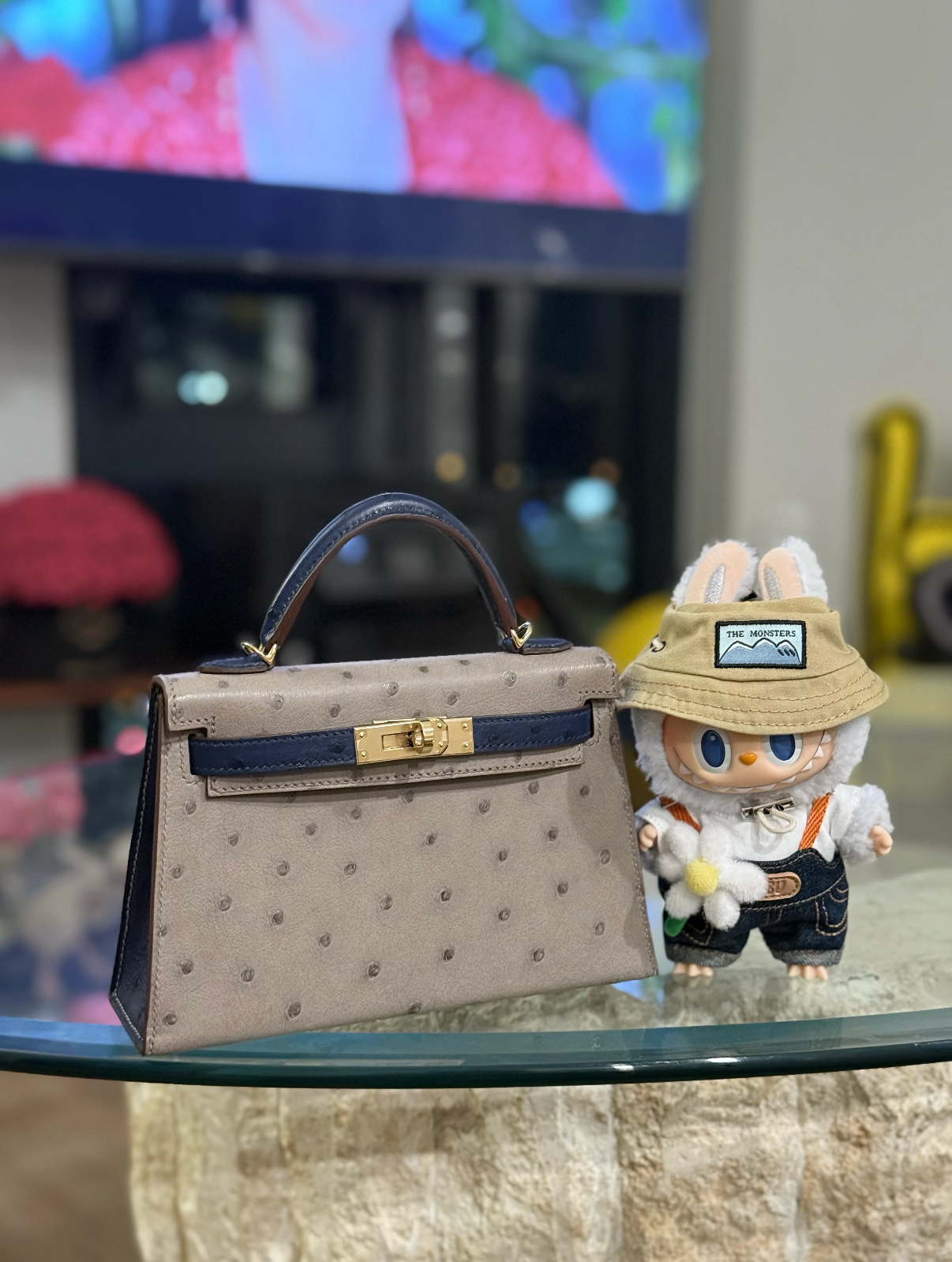 Mini Kelly 19 Dove Grey Iris Blue Ostrich Leather Customizable