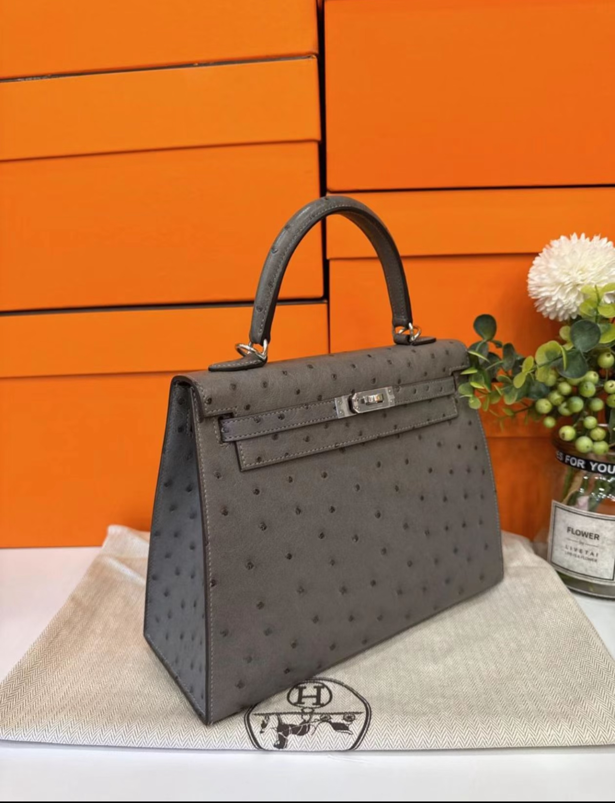 Kelly 25-28 Agate Gray Ostrich leather custom